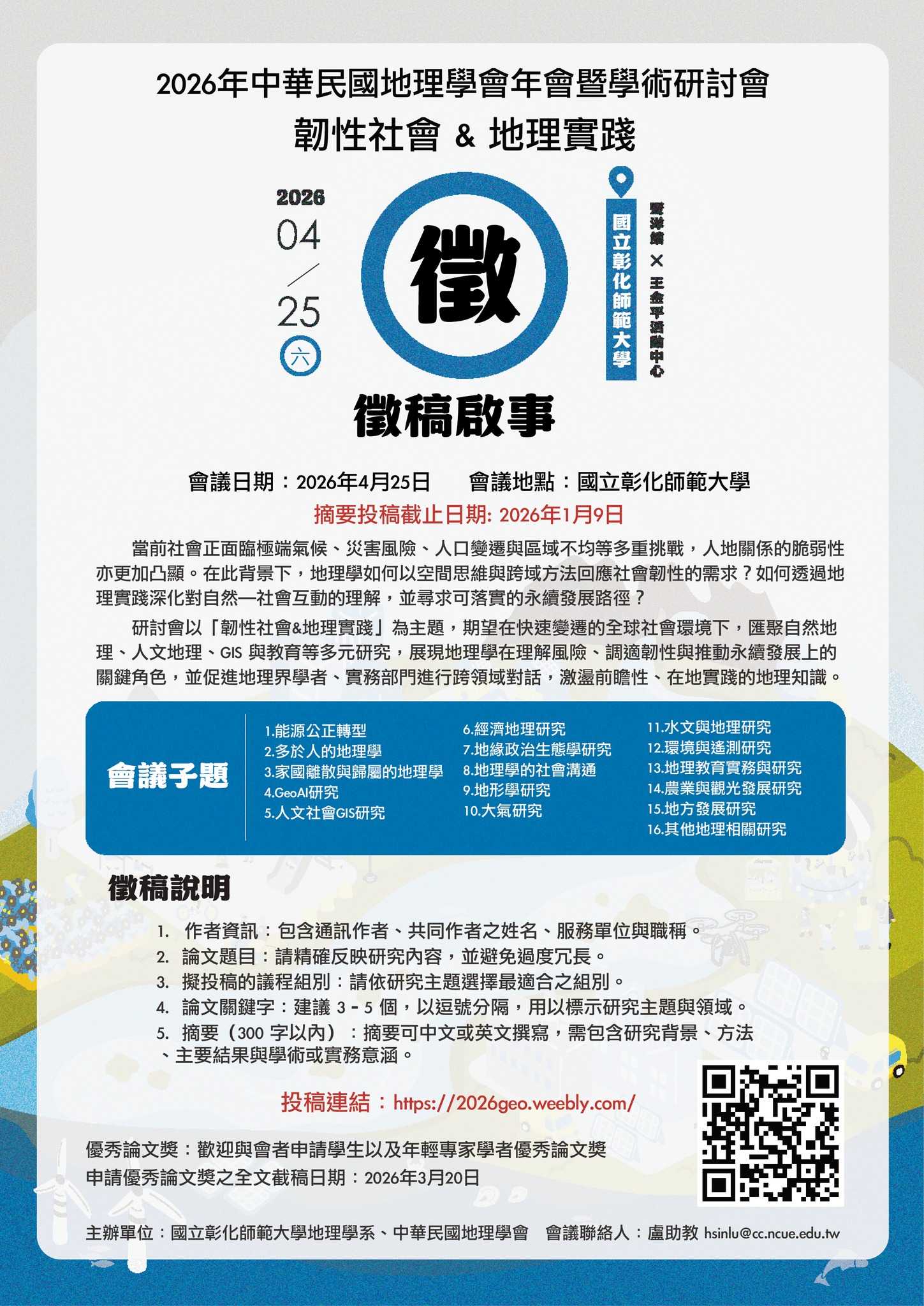 2026年「中華民國地理學會暨學術研討會」將於4月25日在彰師大舉辦,歡迎各位先進與同學來共襄盛舉。