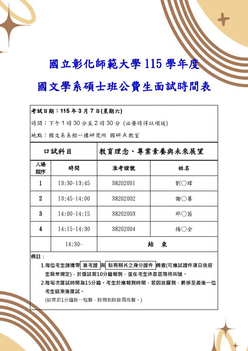 國文系 | 115學年度國文學系碩士班公費生面試時間表
